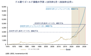 「短期的には調整(下落)が入る可能性もありますが、長期の見通しとして、インクリメンタムというファンドの予想から推測。このファンドは30年までの予想を発表しており、現在の金価格はその予想レンジ内で推移している。には2030年までに1オンス=8,000ドル超、国内価格1g=3万円超を目指す展開も十分にあり得ます。ただし、為替の変動には十分な警戒が必要です。」