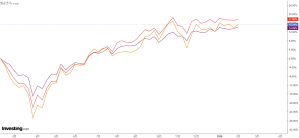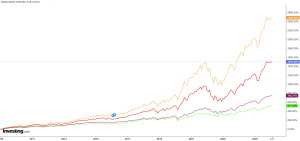 下図は4つの指数の10年チャートです。上から順にナスダック100(オレンジ)、ナスダック総合(赤)、S&P500(紫)、ダウ平均(緑)です。