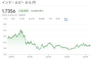 上記はインドルピーと円の為替の推移です。直近こそ、少し上昇の兆しもありますが、過去10年以上、通貨安の状態が続いています。