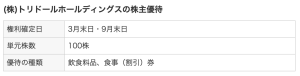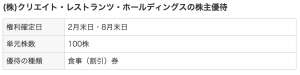 • 優待の真価: 100株以上で食事券(100円単位で使いやすい)。
